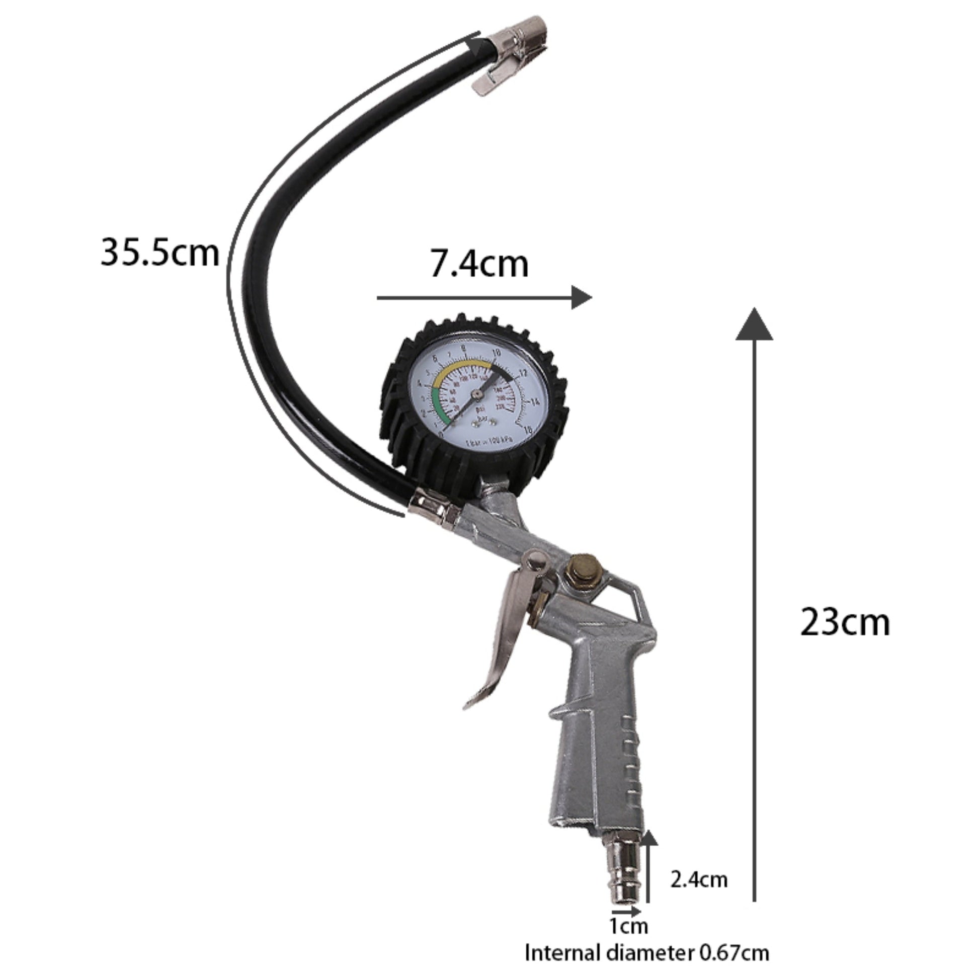 Stay road-ready with this Tire Inflator and Pressure Gauge Kit, designed for quick and accurate tire inflation on cars, vans, bikes, and more. The compact 23 cm size makes it easy to handle and store, while the integrated pressure gauge allows you to inflate tires to the correct PSI without needing to switch tools. Built for everyday reliability, this tool is a must-have for any garage, glove box, or emergency kit. Model: 25/D.