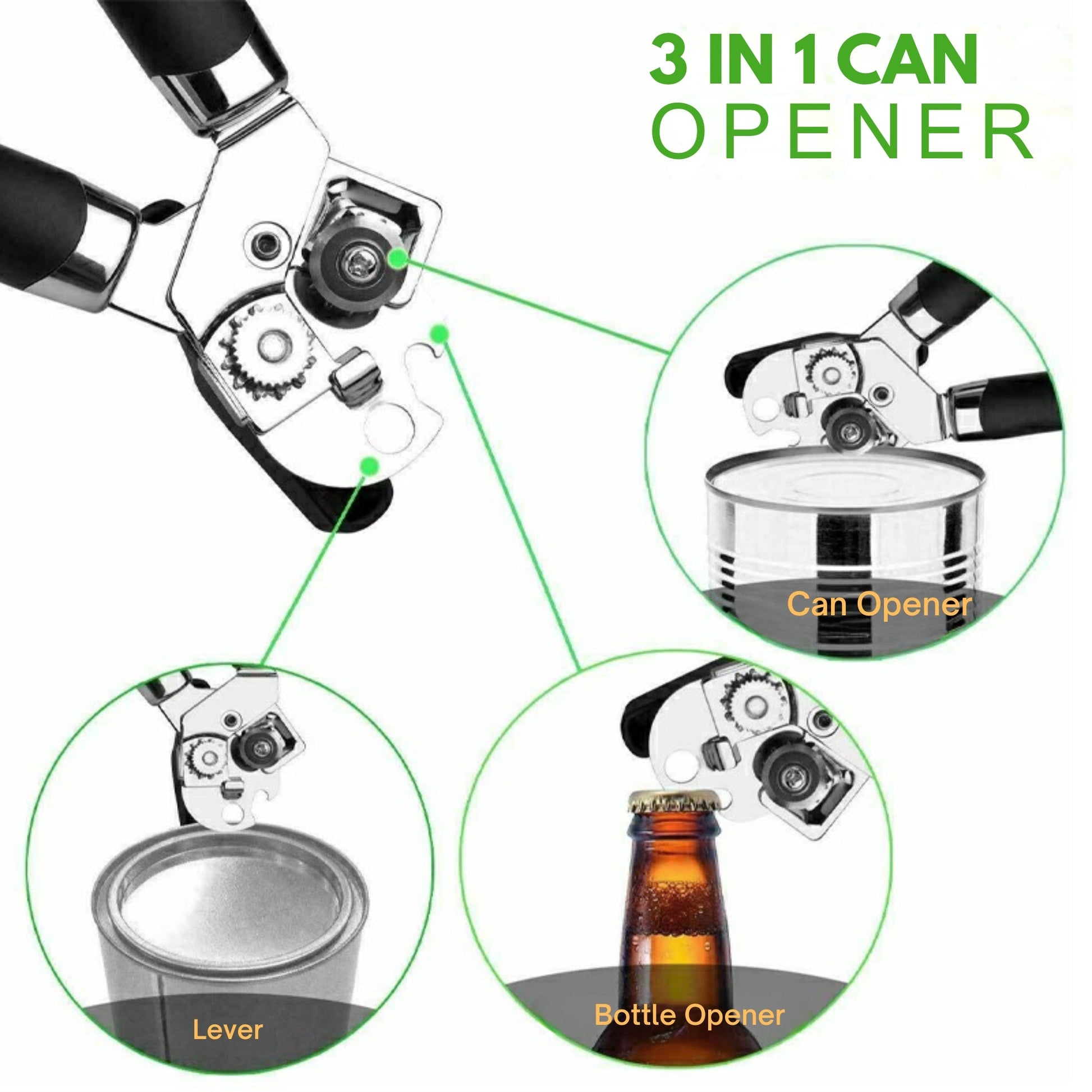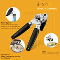 - 3-IN-1 CAN OPENER: Built-in can opener, can lifter/lever, and bottle opener/beer opener. Suitable for a variety of cans, including beer.