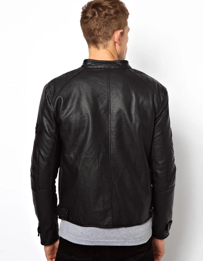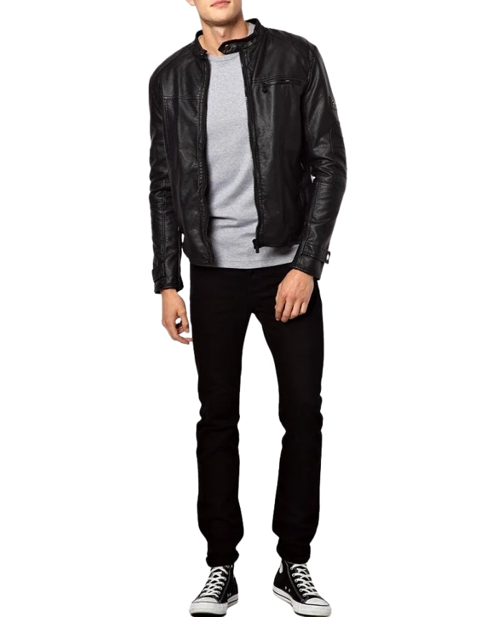 Style: Modern Biker/Moto style with a clean, collarless/banded neckline.